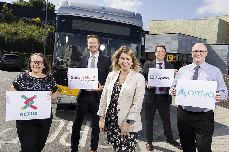L-R, Cathy Massarella, Managing Director at Nexus, Ben Maxfield, NEBus Chair and Business Director at Go North East, North East Mayor Kim McGuinness, David Parker, Commercial Director at Stagecoach North East and Stephen Humphrey, Site Manager for Ashington and Blyth Depots, Arriva.